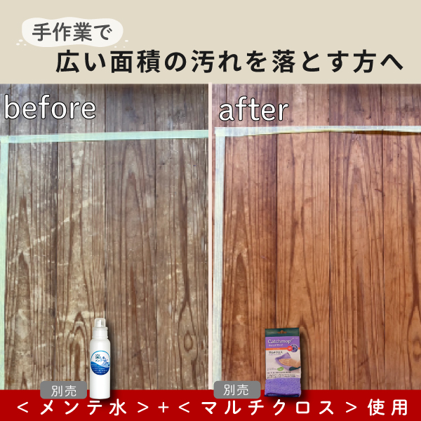 メンテ水(別売)でミストデワックスを希釈した液を汚れた箇所に噴し、クイックルワイパーにマルチクロス(別売)・マルチクロスセットを装着し、ふき取ると汚れが落ちやすくなります。(サムネイル画像9枚目をご覧ください)