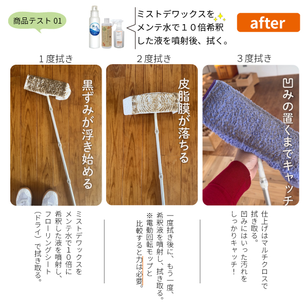 「クロス×ミストデワックス×メンテ水×メンテ水だけでここまで落ちるとは!」社内商品テストでは驚きの声がでました。ちまたで販売しているクロスの中で群を抜く優秀なクロスです。手動なので電動回転モップと比較するとそれなりの時間&力は要ります。しかし、薬剤を使わずここまで落ちればGOOD!