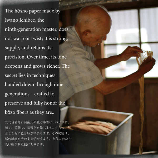 Hōsho by the Iwano family is trusted by artists and institutions worldwide—supplied to the Louvre Museum since 2014—and valued for its soft yet robust feel, pigment-holding capacity, and archival cleanliness achieved through thorough washing and inspection of every sheet.