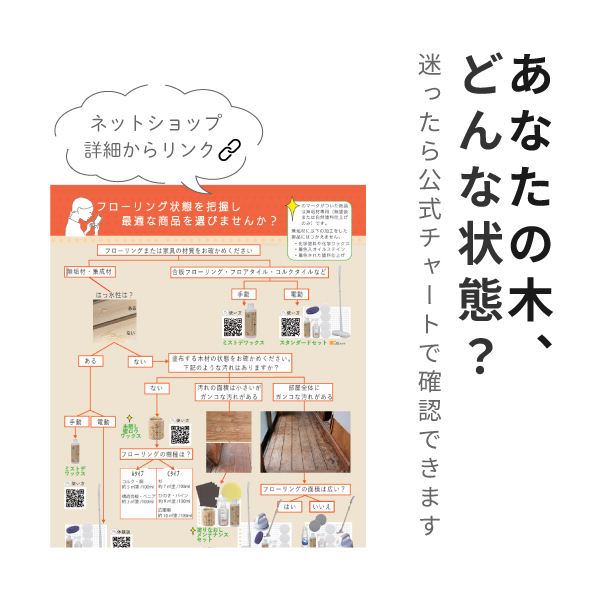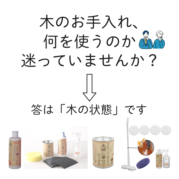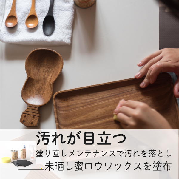 塗り直しメンテナンスセットまたはハンディ無垢汚れ落としセットorコンプリートセットで汚れを落としてからワックスがけをしてください。