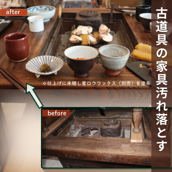 「メンテ水」を加えて無垢の汚れをとる