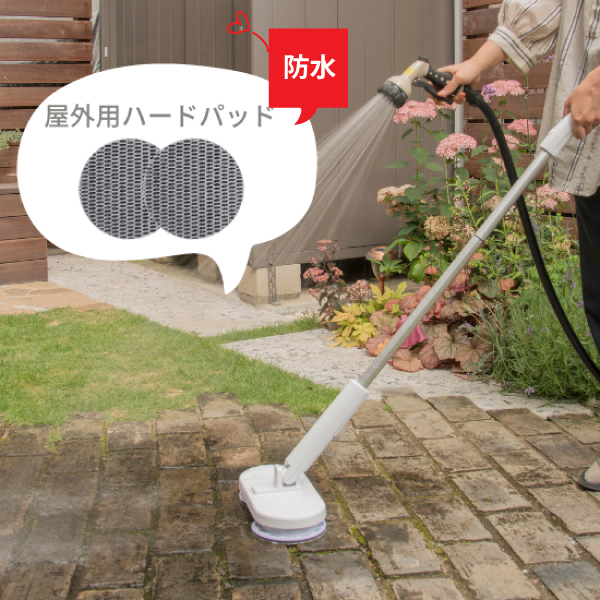 玄関周りのアプローチ(レンガ・タイル・コンクリートなど)、ベランダ(コンクリート)などのお掃除に最適!屋外ならではの汚れを楽してとり除きませんか?この回転モップクリーナーは防水加工なので、水をかけながらのお掃除ができます。