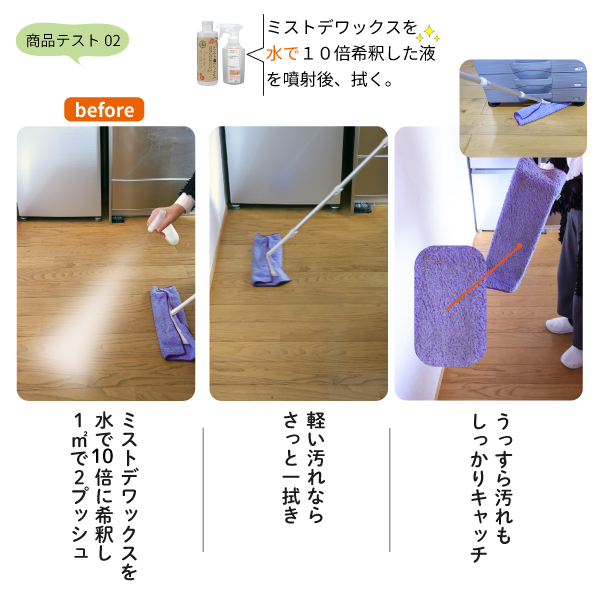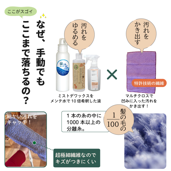 水拭きまたは、ミストデワックスを10倍に希釈しクロスに噴射。汚れた箇所をふき取る